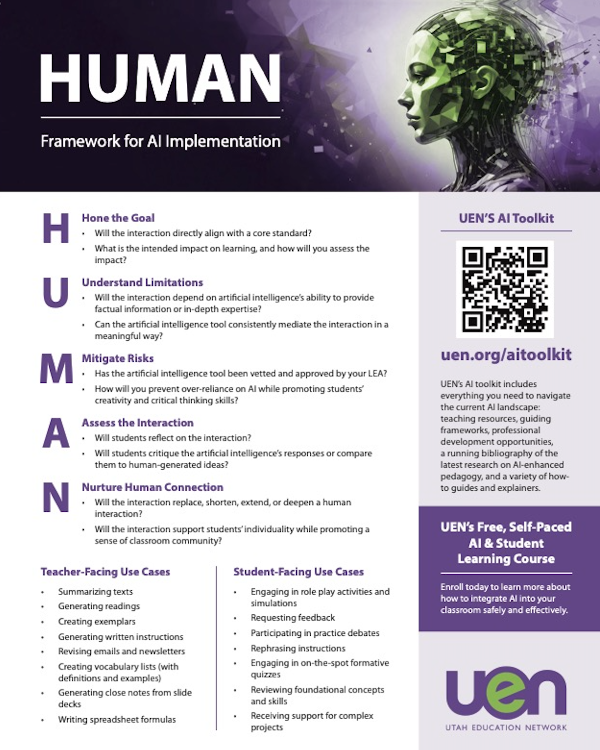 If you've been wondering how to bring AI into your classroom without losing what makes teaching human, UEN's HUMAN Framework might be exactly what you've been looking for. This practical, five-step guide walks educators through the kinds of questions we should all be asking before we hand students — or ourselves — an AI tool and say "have at it."